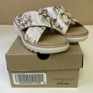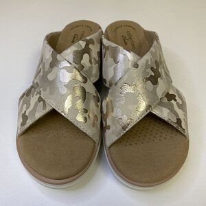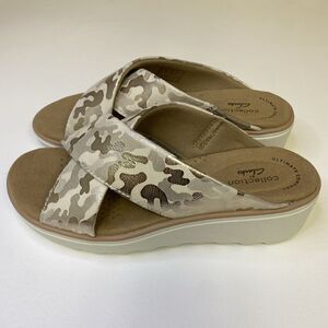 Clarks Collection Jillian Wedge Slide Criss Cross Sandals Tan Gold Camo Size 6