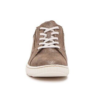 Stylish and comfortable, these Clarks Collection Carolina Ella sneakers feature a perforated metallic Bronze leather upper and cushioned sole, ideal for casual wear.