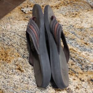 Clarks Collection Men's Sandals Get ready for comfort and style with these Clarks Collection men's flip flops sandals. Perfect for casual outings or a relaxed day at the beach. Size: 9 US / 8 UK / 42 EU Color: Brown with red accents Material: Durable synthetic uppers with rubber soles Condition: Used - Shows signs of normal wear, as seen in photos Item ID: 26114999 The sandal features a comfortable footbed with a sturdy outsole designed for long-lasting wear. Note: Please examine the photos carefully for condition details.