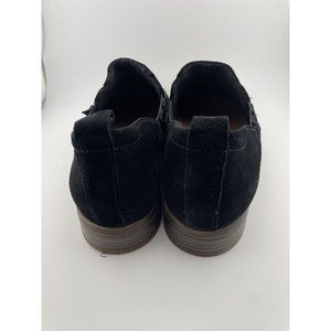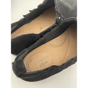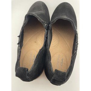 These Clarks Booties are in excellent condition, like new! They are a beautiful velvety black suede. They are truly comfortable yet stylish. They have added studded details on the sides. They have elastic on the sides for easy on and off. They have a slight block heel about .75 inches in height. They measure about 10.5 inches on the bottom of the shoe for size reference.