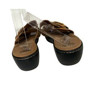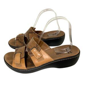Clarks Collection Womens Size 9 Slide Sandals Lexi Snake Print Beige Tan Hook & Look Comfort Wedge Soft Cushion Adjustable