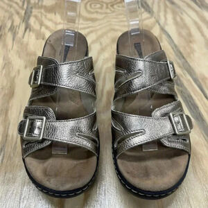 Clarks Collection Women's Slide Sandals Soft Cushion Sz 9.5 Metallic Gold. Adjustable straps.