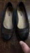 Clarks Cushion Soft flats women’s size 7.5 US / EU 38. Black and brown slip-on loafers with stitched detail and brass rivets. Rounded toe, soft insole, low wedge heel. Model: 60506218. Made in China.