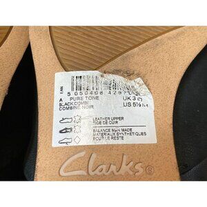 Clarks Cushion Pure Tone Womens Sz 5.5M Black Leather Slip On Heel Loafers Flats. The soles show light signs of wear to the bottom and scuffs to the soles edge but these are otherwise in very good preowned condition. Please message me prior to purchase with any questions. Thank you!