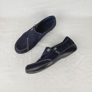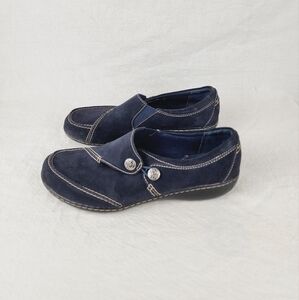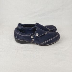 Elegant dark blue loafers by Clarks. Features button accents and contrast stitching. Perfect for everyday wear.