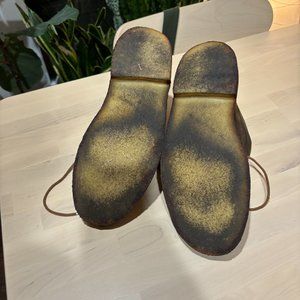 These have been worn in, and at one time stained a darker brown. They have been hand washed, and as a result the bottom of the show is somewhat sticky and the leather is firm.