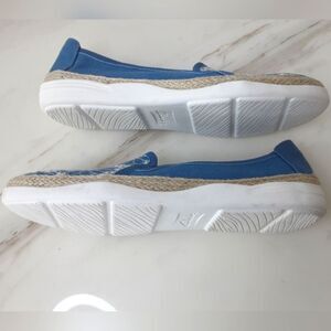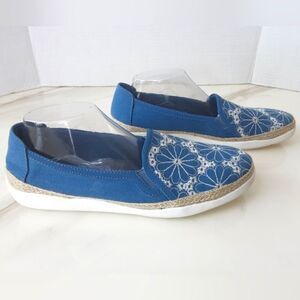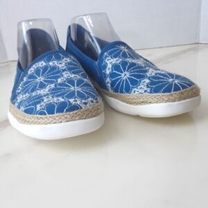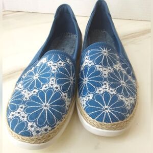 Clark's Elaina Harbor Floral Embordered Blue Denim casual slip on features trendy Jute wrapped detail above the rubber soles and soft faux suede trim. Ultimate comfort polyurethane foam interior lining. Unfortunately the signature foot beds are not included. The Clarks brand is known for its quality, comfort and these shoes are no exception. They are perfect for everyday use and the floral blue denim adds a touch of elegance to your outfit. The shoes are ideal for those looking for comfort without compromising on style. In like new condition.