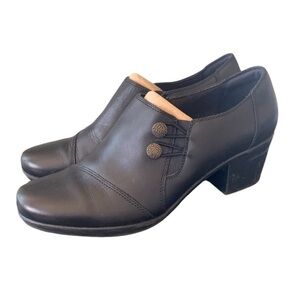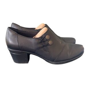 Clarks Emslie Warren Black Booties Side Zip Size 10. Excellent condition. Inside zipper, ornamental button accents, cushioned insole.