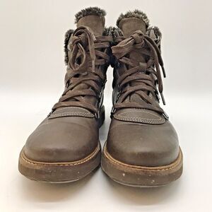 Clarks Glick Clarmont Khaki Ankle Boots. Women's size 8M, Brown Leather, Faux Fur Trim, Lace Up, Hiker style Shoes.