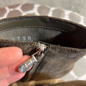 These Clarks ankle boots are crafted from a rich olive green suede, offering a sleek and minimalist design. The convenient side zipper ensures easy wear, while the low stacked heel provides comfort. The slightly rounded toe adds a touch of elegance to these versatile shoes.