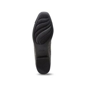 These elegant Clarks heels combine a sophisticated gray fabric body with a sleek black patent leather cap toe, offering a refined look suitable for professional settings. The cushioned insoles enhance comfort for all-day wear.