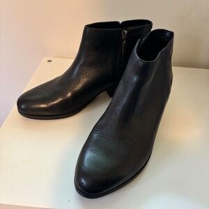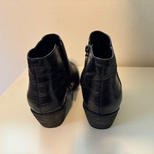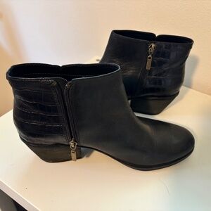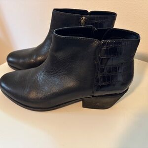 Black leather zip-up ankle boots. Alligator pattern on back/heel. Very gently used. I am the original owner and have only worn them twice.