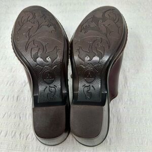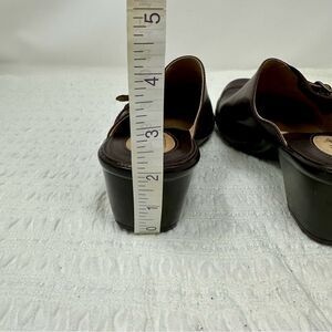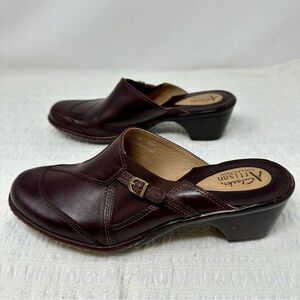 Excellent used condition clogs from Clarks. They re a size 8, made of a rich brown leather, and feature an adjustable buckle strap midfoot.
