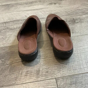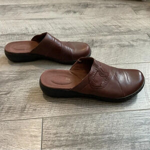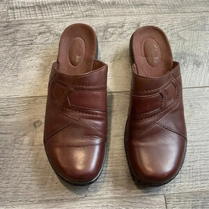 Clarks Leather Slip On Mule Clogs. Womens Size 7N. The one shoe has the leather part bent. Leather upper. Gentle used condition. Normal wear. The shoes have been cleaned. See pics for conditions. No modeling or trades.