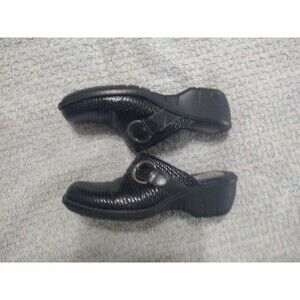 The product is a pair of Clarks leather weaved clog shoes in black, size 9. These classic and comfortable shoes are designed for women and feature a slip-on closure. Made with leather upper material and standard shoe width, they are perfect for casual wear. Clarks is a trusted brand known for its quality and timeless style, making these clog shoes a versatile addition to any wardrobe.