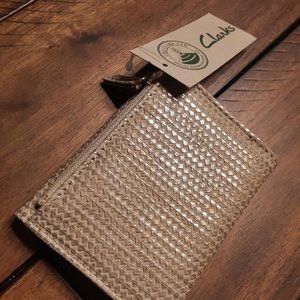 Clarks leather woman's wallet. Brand new, never been used. Tags still attached. Beautiful metallic design. Large cash compartment with card holders and protected ID slot. Zipper coin pocket on back.