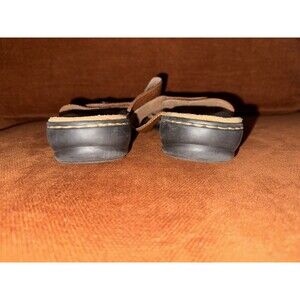 Clarks womens brown leather slide sandals in size 12 wide, featuring a stylish two-strap design with subtle perforated accents and decorative button details. Cushioned footbed for lasting comfort and a durable rubber sole for all-day wear. In great pre-owned condition with light signs of normal wear. Perfect for casual outings or everyday wear.