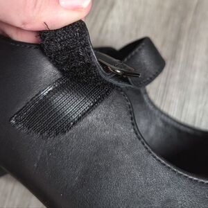 Genuine leather uppers and linings. Hook and loop closure strap. Arch support cushy insoles, are discolored but have been cleaned, they are removable if you want to use your own. 1.75" block heel. Grippy rubber bottom soles. True to size