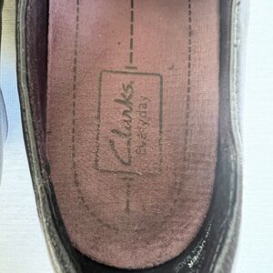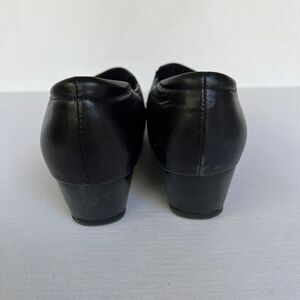 Clarks Everyday Sugar Spice Heeled Loafers in Black Leather. Size 7W. Style 85140. 1.75" heel. There are some scratches and scuffs on the leather.