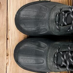 Rugged and versatile, these Clarks men’s size 8 Bowman Peak boots feature a durable black leather upper with a waterproof duck boot design. The high-top silhouette and sturdy rubber sole provide traction and support, making them ideal for casual wear or wet-weather days. A perfect blend of outdoor function and everyday Clarks comfort.