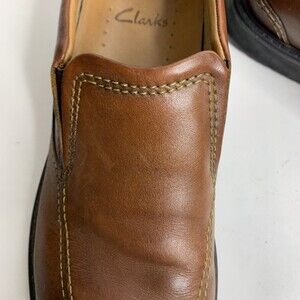 Clarks Mens Loafers Shoes Brown Leather Bicycle Toe Slip-On 8M. The shoes are in really good condition. They look to only been warn once or twice. No bottom wear or heal wear.