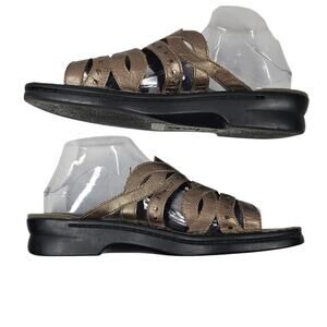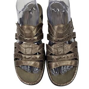 This is a pair of comfortable leather, open toe slides from Clarks in a Women's Size 9. They are in EXCELLENT PRE-OWNED CONDITION. It is style #37386, and features metallic bronze leather straps with a cutout design. The color is neutral and will match any outfit. Perfect to wear with dresses, shorts, jeans, or dressy slacks, and comfy enough to wear all summer long!