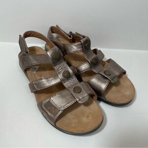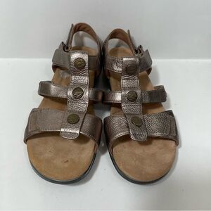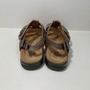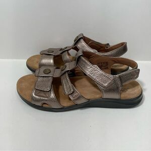 Gently worn women's size 7.5 Clarks Metallic leather outdoor athletic sandals. Velcro closure, comfort footbed. Please review all photos for any signs of wear-pictured as is. Disclaimer: Any items with any wear/staining has not been treated, and unsure of ability to remove/treat condition. Comes from a smoke free home, bundle with other items to save & minimize shipping cost.