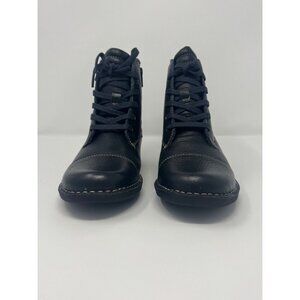 The Clarks Navy Leather Whistle Bea Flannel Detail Ankle Boots in size 7 are a stylish and comfortable choice for women. With a low heel height and wide shoe width, these ankle boots are perfect for everyday wear. The navy blue color and flannel fabric detail add a touch of flair to the classic Clarks design. Made of leather, these boots are durable and versatile, making them a great addition to any wardrobe.