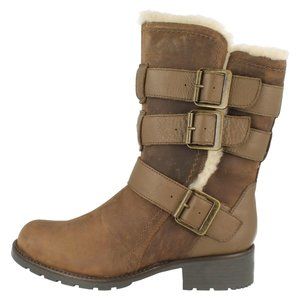 Clarks Orinoco Bloom leather fur lined Ankle Boots. NEW IN BOX. Size 7.5 Mid- Brown good quality stiff Leather with 3 buckle feature. Man-made sole. Part of the Clarks Artisan range. Zip up fastening.