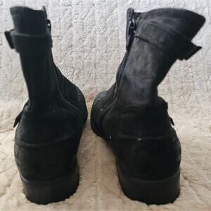 Classic high quality leather suede moto boots with a double belt buckle design. Has a zipper closure on the inner side of the boots. Intentional distressing and wear to the suede. In good pre owned condition.