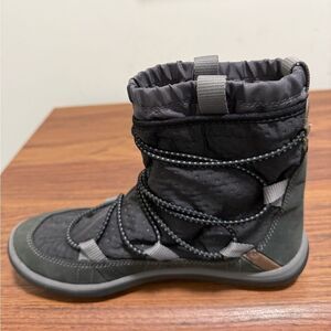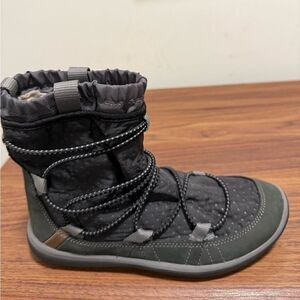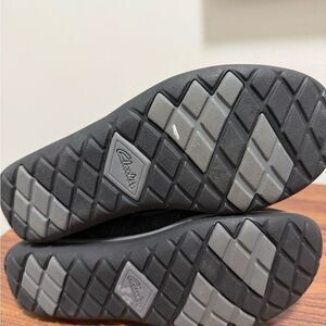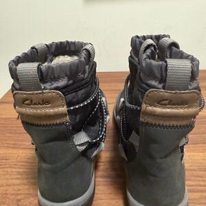 Privo by Clarks suede & textile slip on winter ankle boot with stretch bungee laces. Features removable footbed, rubber lug outsole, polyester fleece lining. These boots will cover your ankle with an additional elasticated layer. Clarks logo on back.