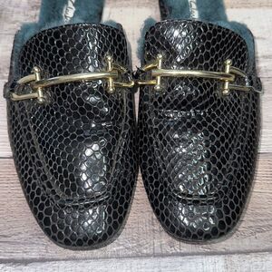 Clarks Pure 2 Mule Black Leather Gold Bit Shearling Slip On Slides Slippers | Si
