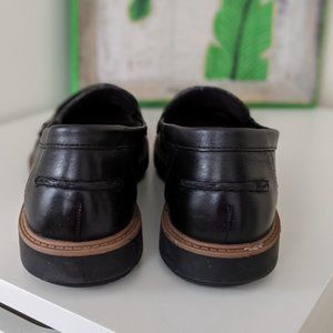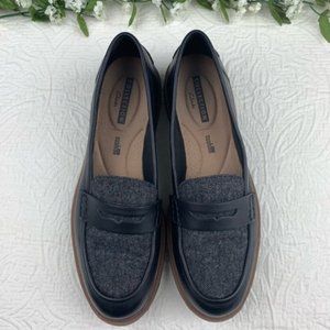 Black leather with a gray tweed top, soft cushion, ortholite footbed