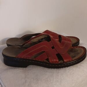 Stylish red leather slide sandals with a comfortable design. Size 9