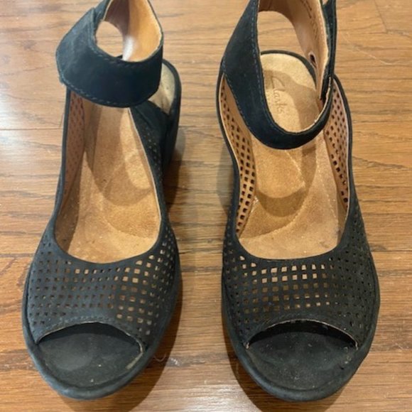 Clark’s Reedly Salene Wedge Sandal in black. In good condition. Size W 7. Heel height: 2 3/4” with 1” platform.