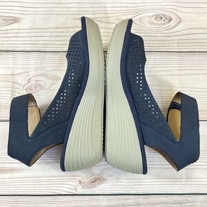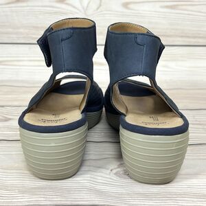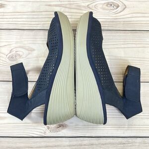 Clarks Collection Reedly Salene Perforated Navy Blue Nubuck Leather Wedge Sandals Ankle Strap Peep Toe Comfort Casual - Women's Size 8M.
