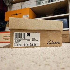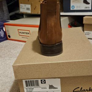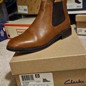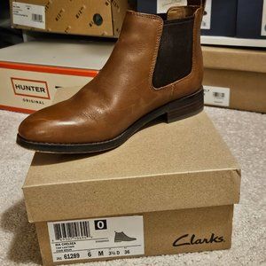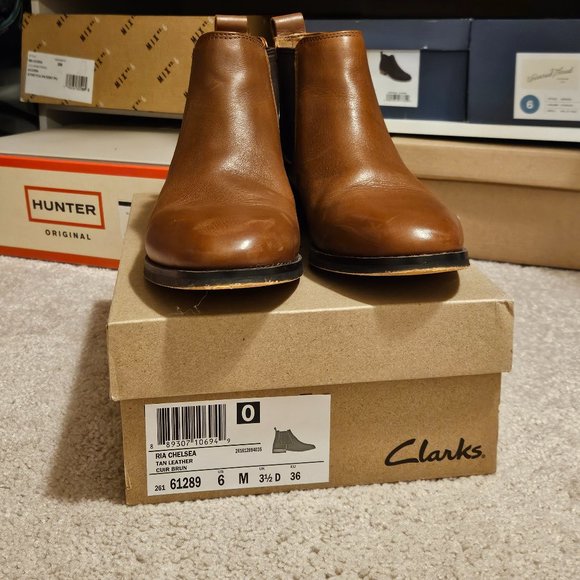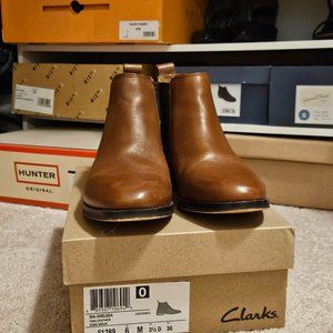 Clark's Ria Chelsea boot with tan leather upper. Boot is size 6M. Lightly used since worn once.
