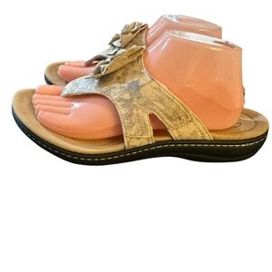 Fall in love with the Laurieann Gemma sandal by Clark’s. Fashioned of faux leather with beautiful flower detail and an Ortholite foam memory insole with moisture-wicking, impact absorption for all-day comfort. Designed to move naturally with the foot, with fabric lining and an adjustable Velcro strap for a perfect fit. Outsole is flexible, lightweight EVA rubber. In excellent condition, like new condition! If you have any questions or need more pics, just ask:) Thanks for looking and I ❤️ offers!