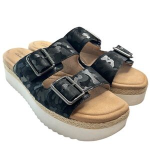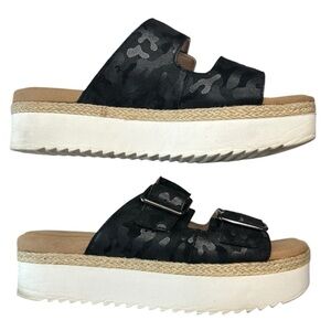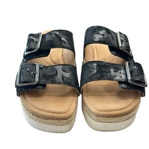 Clarks Womens Size 8 Black Animal Print Double Strap Platform Ultimate Comfort Cushion Sandals