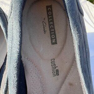 Clarks Sharon Dasher Blue Suede Loafer. Twist tie on top. Super comfy. Size 9.5W. An OrthoLite footbed provides supreme cushion and breathability, perfect to be worn sockless. The Sharon Dasher is crafted from premium suede, with a twist-detailed front.