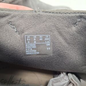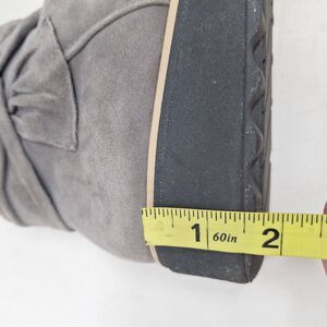 These Clarks Collection Sharon Salon Grey Suede Ankle Booties are in good used condition, they have some minor wear to the soles. These indie style ankle booties have a side knot and a side zipper closure. These minimalist style boots have a wedge heel and are perfect for everyday casual wear.