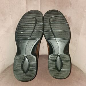 These Clarks Shoes in size 9.5 are classic brown leather Derby Oxfords with almond toe shape and lace-up closure. They are perfect for casual, workwear, and travel occasions, providing comfort and cushioning with a leather upper and outsole material. The solid brown color and stylish design make them versatile for various seasons such as winter, spring, summer, and fall. Perfect for men who appreciate quality shoes that are both fashionable and functional.