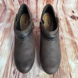 Clarks Size 10 Brown Leather Ankle Booties Side Zip Buckle Block Heel Boot Shoes