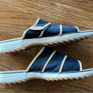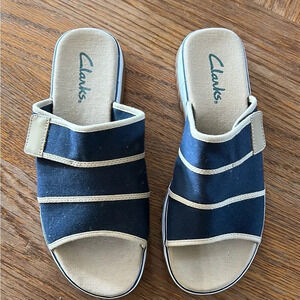 Clarks Slip On Sandals Slides Blue Tan Canvas Hook Loop Closure Size 9M