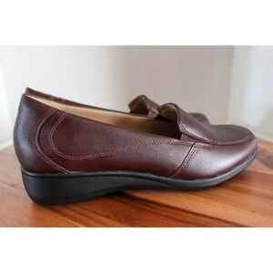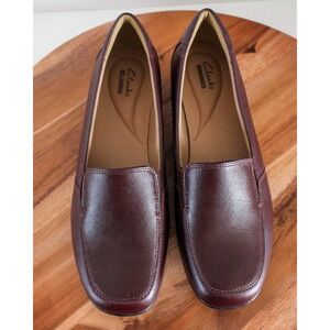 Keywords: Clarks loafers, womens loafers, burgundy loafers, leather loafers, slip on shoes, comfort shoes, casual shoes, size 10M, low heel loafers, walking shoes, Clarks Collection, Gael Angora