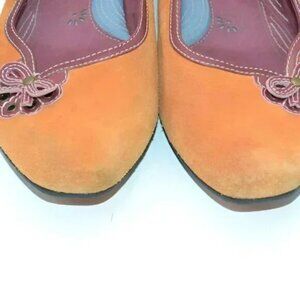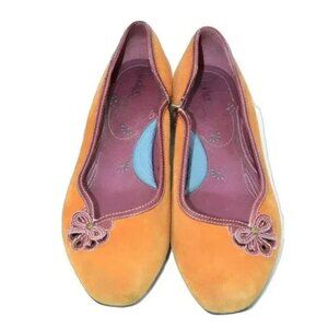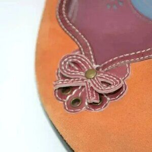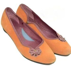 Offered is this darling pair of Clarks flats for the Indigo line. The shoes are soft suede leather in nutmeg spiced orange with burgundy trim and embellishment. The shoe are in gently pre-owned condition with a smidge of scuffing of toes but otherwise in nice condition with light wear.