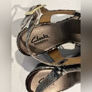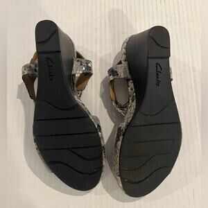 Clarks Star Gaze Wedge Heel Gray Black Snakeskin Strappy Bendable Sandals Sz 9