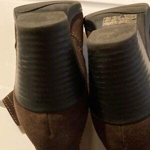 Comfortable brown suede ankle boots with 2” stacked heels, cute buckle detail, inner side zippers.