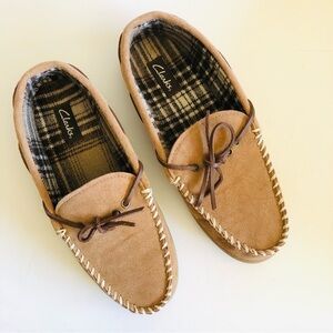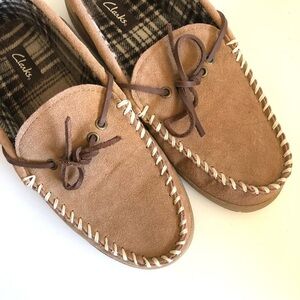 Clarks suede moccasin slippers with rawhide laces on one slipper shorter than the other, otherwise they’re in excellent condition.