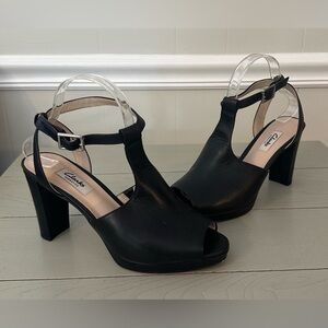 Clarks Sz 8 Kendra Charm Leather Sandals Black T-Strap Block Heel Open Toe Women